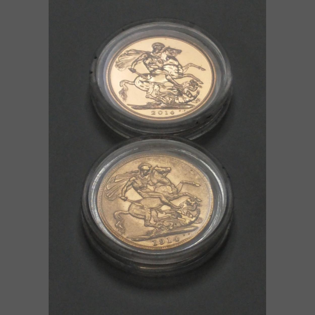 From The London Mint Office - a boxed set of 2 gold sovereigns - Centenary of the Great War 1914 & 2014 Sovereign Set in coin cases.