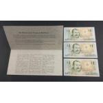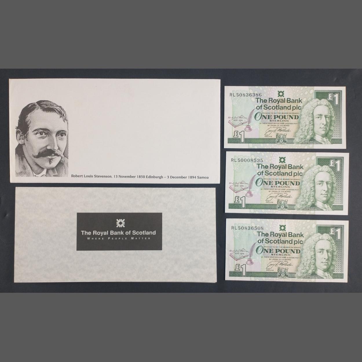 ROYAL BANK OF SCOTLAND Robert Louis Stevenson three crisp uncirculated one pound banknotes in folder. Unsequential.