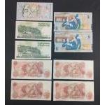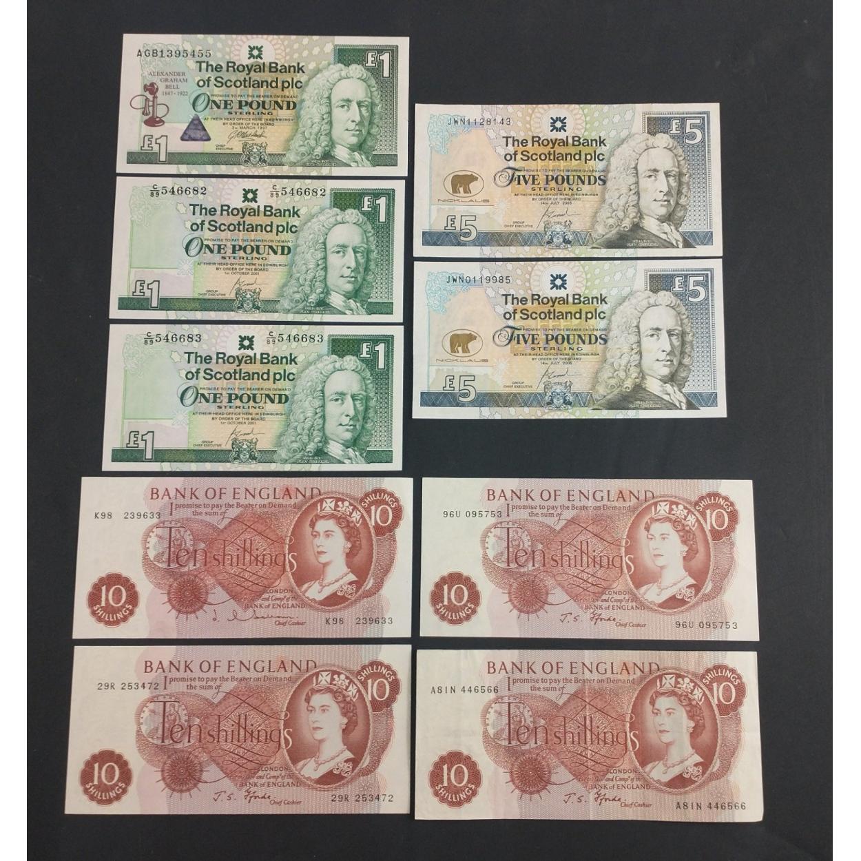 A super collection of excellent Royal Bank of Scotland collectible notes to include two nice grade 2005 Jack Nicklaus Five Pound notes, a sequential pair of 2001 One Pounds, a crisp Alexander Graham Bell. Lot includes four Bank of England crisp 10 Shillings. A nice collection of super notes.