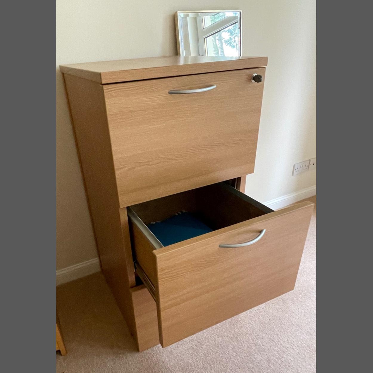 A wooden three drawer filing cabinet with lock and key - to include some file folders within. 18"W x 15"D x 3.5ftH approx