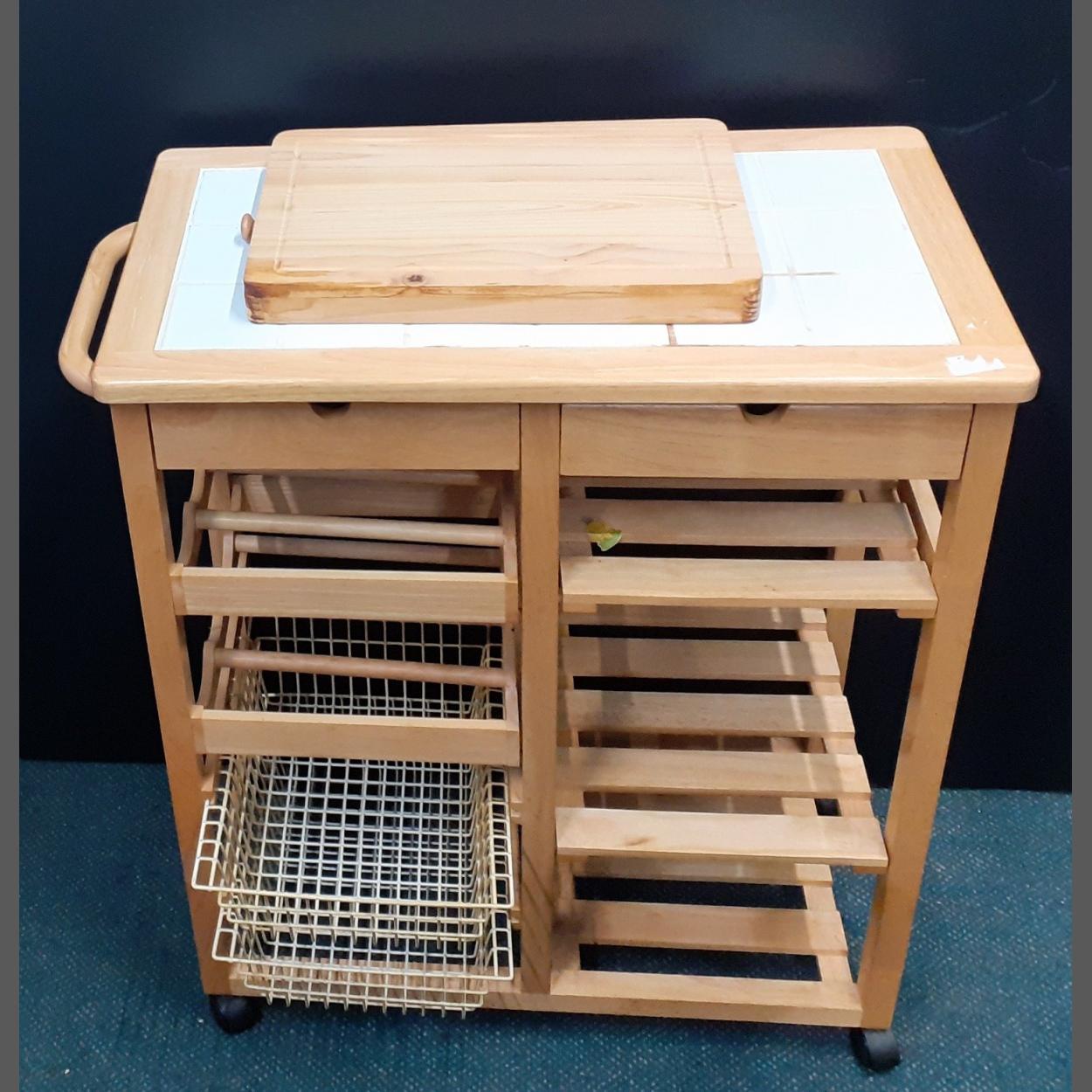 A pine mobile kitchen island unit with tiled top and 2 drawers and plenty of storage space. 2ftW x 15"D x 3.5ftH approx