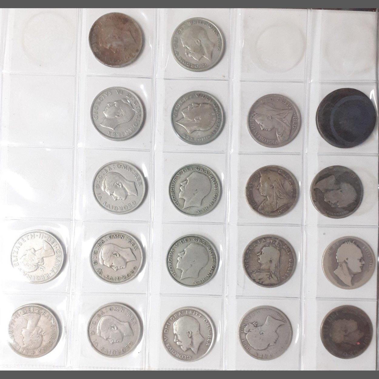 A coin storage album page containing a super selection of HALF CROWNS. Includes seven post-1947 however also includes 1886 young head Victoria, 1817 George III, William IV x2 and cartwheel penny with wear. A super selection.