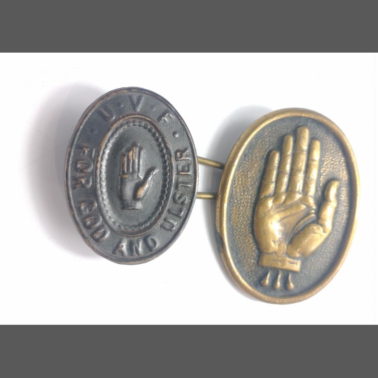 BEYOND SCARCE. Ulster Volunteer Force UVF / 36th Ulster Division early WW1 cap badge with button hole badge. Very rare to find, worn by soldiers of 36th Ulster Division until regimental patterns were introduced. Cap badge by Sharman D Niell Ltd, Belfast 35mm, hook detached. Button hole badge 29mm and stamped CN9386. We have been informed that The 'CN' on the lapel badge stands for Belfast North,meaning that the soldier that this badge belonged to was from North Belfast.