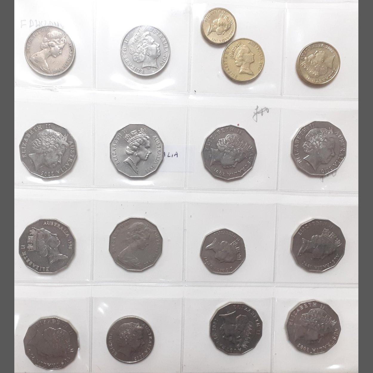 A selection of AUSTRALIA coinage of numismatic interest on a coin storage album page. Includes 50 cents with various reverses.