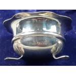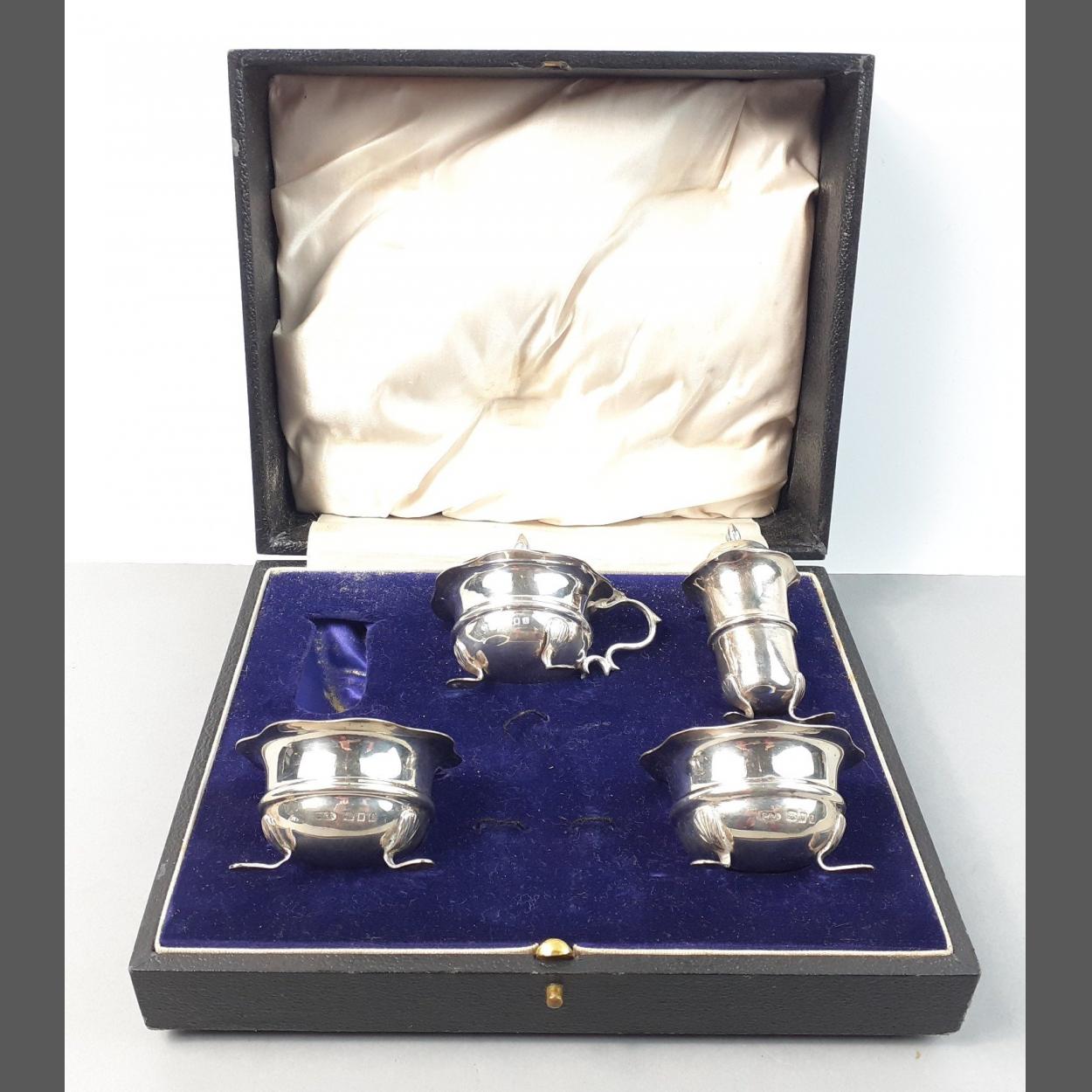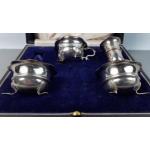 A boxed condiment set with 3 dishes (all with Bristol liners, 1 damage repaired) hallmarked London 1924 and a matching pepper pot with faded marks, weight exc. liners 140g approx