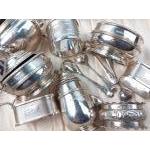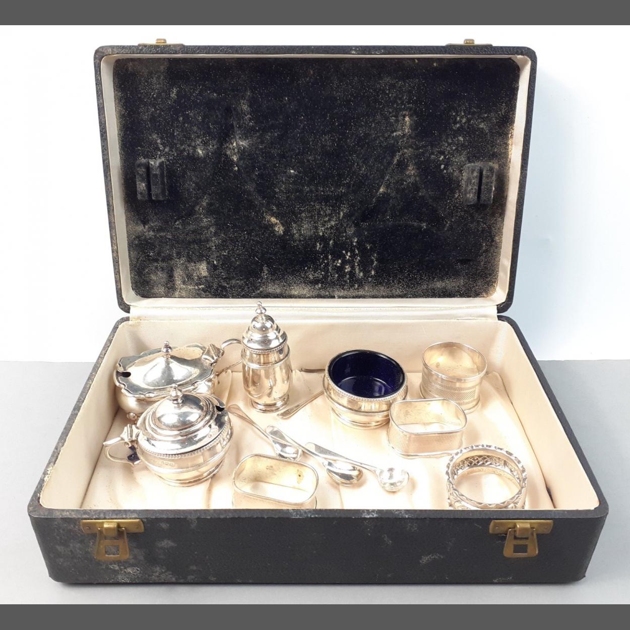 A collection of silver condiment items to include 4 varying napkin rings, 5 condiment spoons, various dishes (3 with liners). Total silver weight exc. liners 306g approx