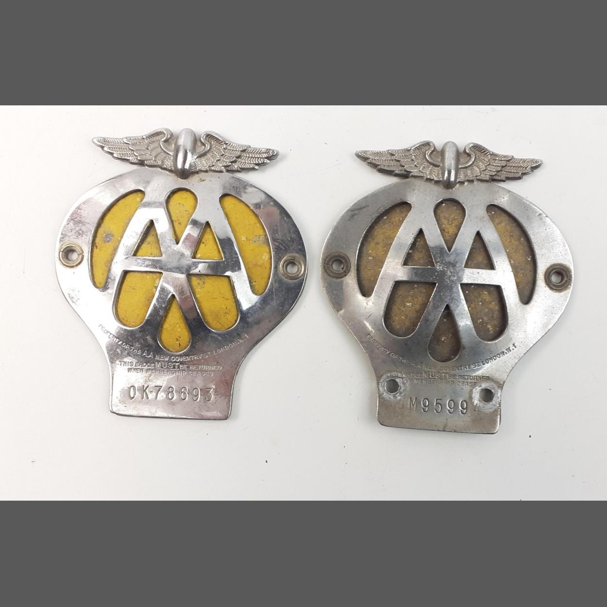 Two vintage AA Membership badges numbers OK78693 and M9599