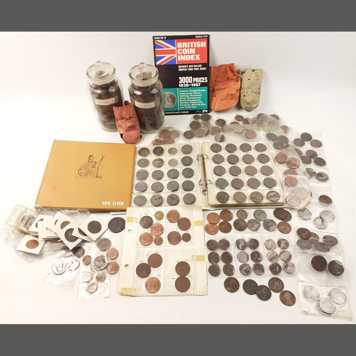 A great lot of collectible UK obsolete coins to include two sweet jars filled with over 600 copper pennies. A further album of copper and much loose coinage from an older enthusiast's collection. A great lot worthy of searching through.