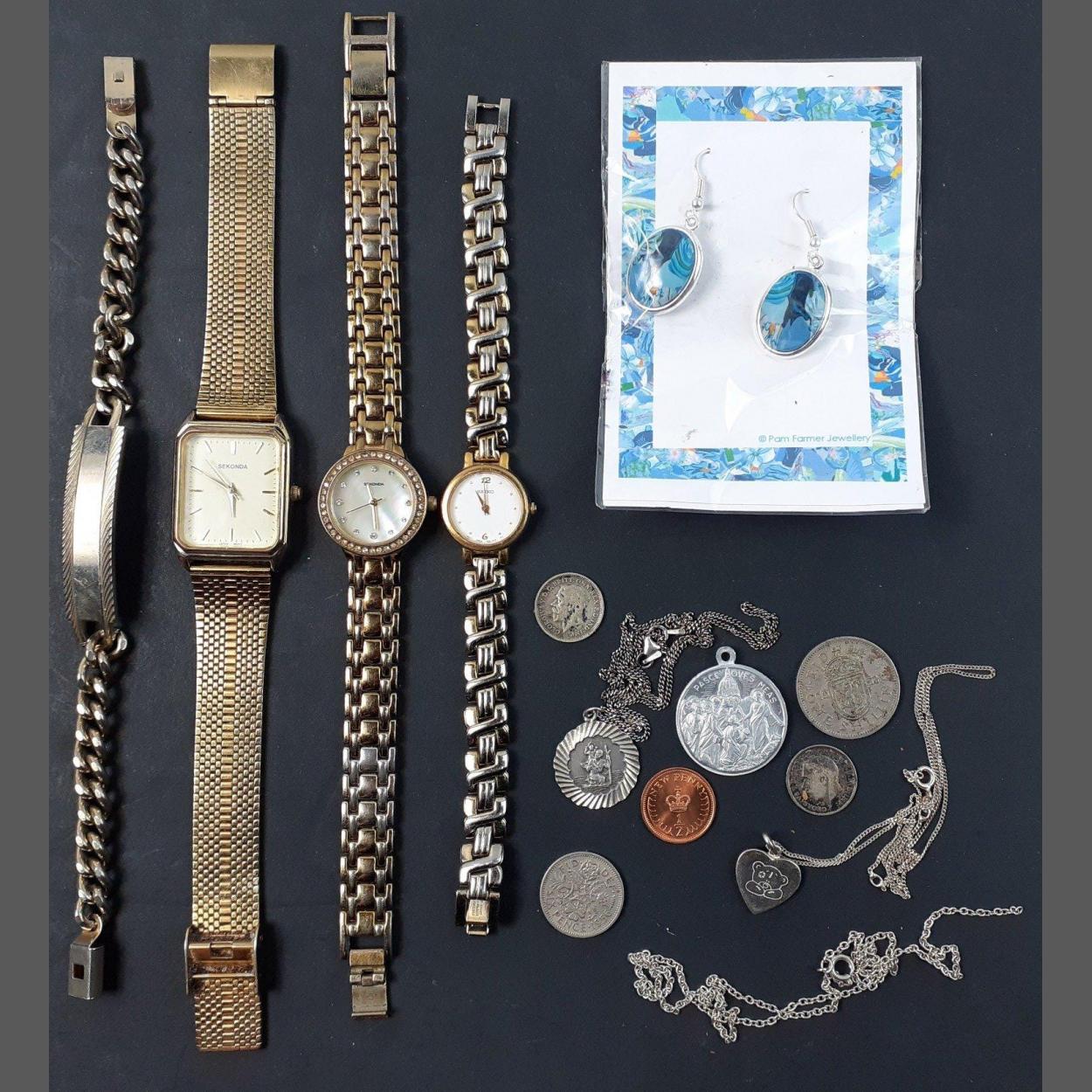 A small mixed jewellery lot to include 2 Sekonda watches and a Seiko ladies cocktail watch, 3 silver chains and 2 silver pendants, weight 12.25g approx, plus 2 silver 3 penny coins, a pair of Pam Farmer drop earrings12.25g approx