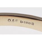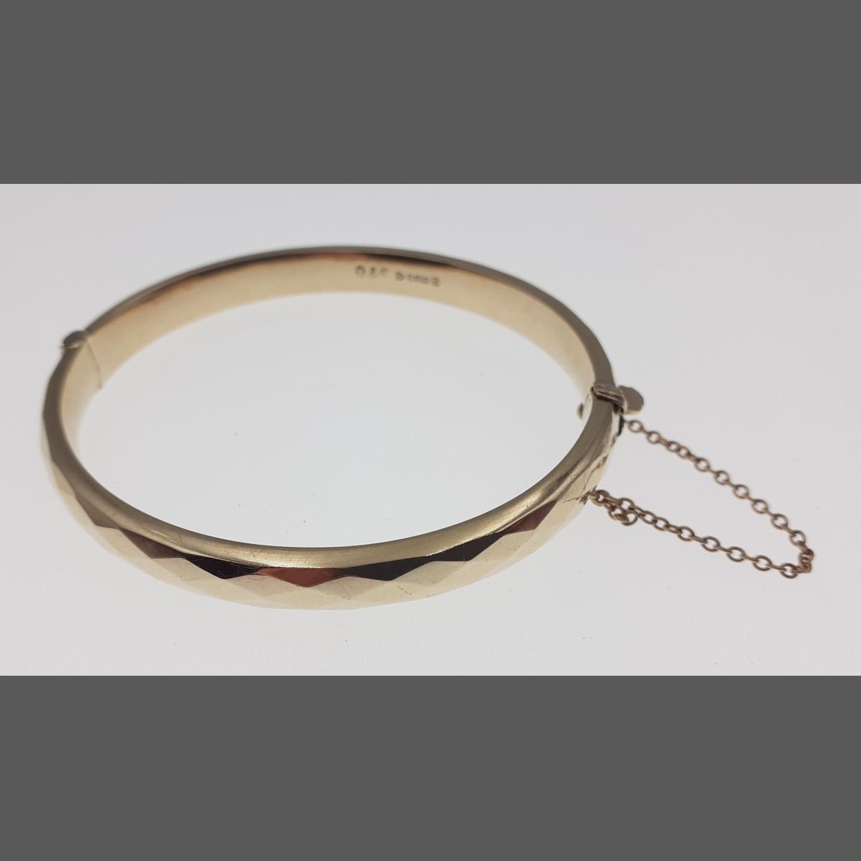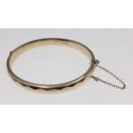A snap-shut gold bangle with safety chain hallmarked for Birmingham and stamped 375, interior dia. 6cm approx, 9.00g approx