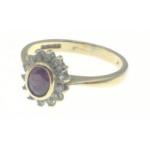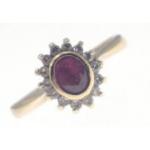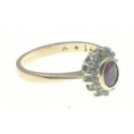 A 9ct hallmarked gold ring set with 14 small diamonds (tested) and a centre red stone, size I, gross weight 1.96g approx