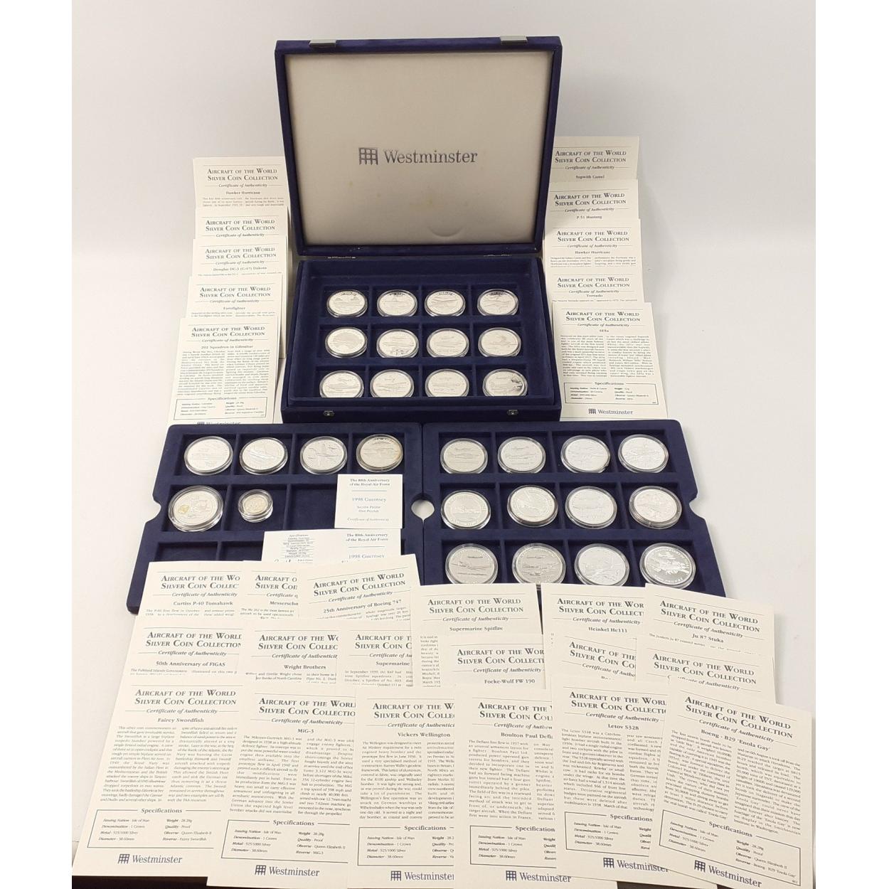 WESTMINSTER MINT. AIRCRAFT OF THE WORLD Silver proof coins collection in original case. 28 original silver proof coins with certificates depicting famous world aircraft. Includes an additional proof Guernsey £5 with gold cameo and a proof Silver £1. A super well stored and presented collection of wonderful coins.