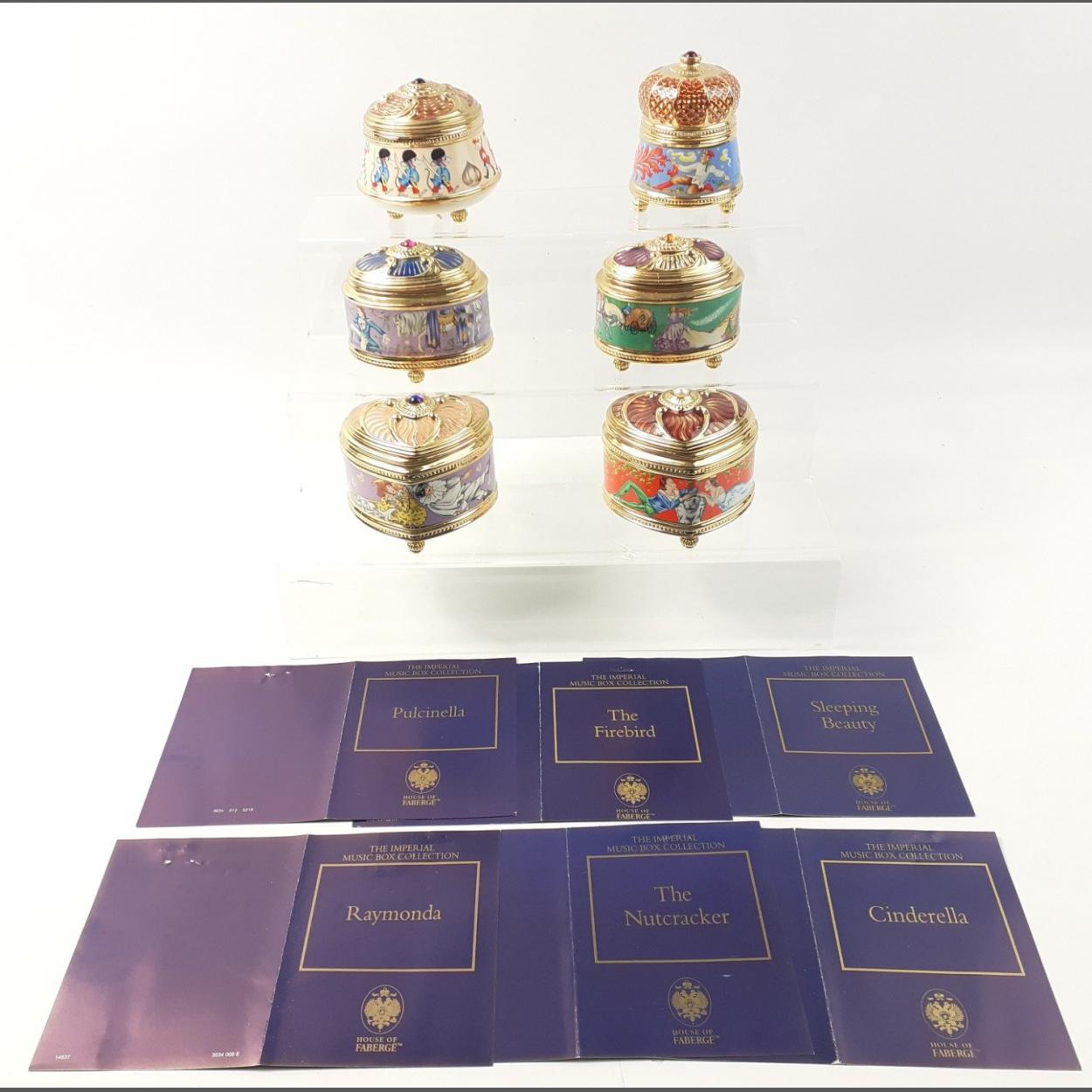 HOUSE OF FABERGE. The Imperial Music Box Collection. Six exquisite enamelled music trinket boxes in lovely condition with certificates. To include Sleeping Beauty, The Nutcrackers, Raymonda, Pulcinella, Cinderella, The Firebird.