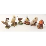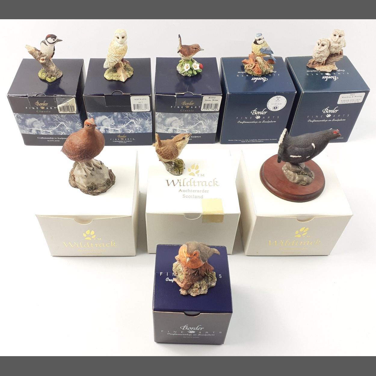 A collection of boxed BORDER FINE ARTS Scottish made figurines to include Watching & Waiting (PR01), Woody (B1450), Autumn Blues (SRE4), Nightwatch (B0175), Jenny Wren (B1033), Gardener's Friend (SRE6) plus 3 pieces from WILDTRACK of Auchterarder to include a wren (slight damage to beak), a red grouse, and a black grouse. All in otherwise excellent condition with no visible damage.