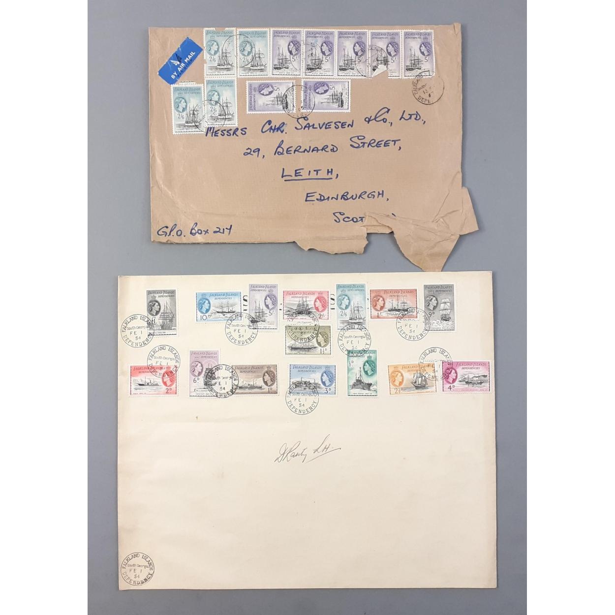 STAMPS Falkland Island Dependencies 1954-62 SGG26/40 - 1954 Definitives Full set to £1 on envelope. Includes one other cover with over 40/- on stamps to Christian Salvesen Leith.