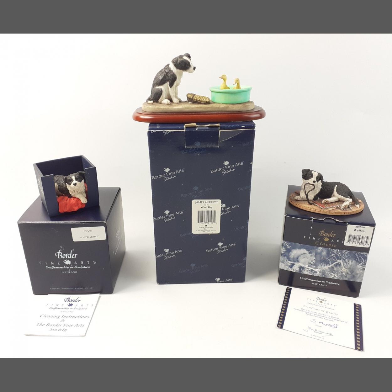 Three BORDER FINE ARTS Scottish made figurines on the theme of dogs to include A New Home (CEV03), and Walkies (B0860) plus a James Heriot Wash Day (A0193)