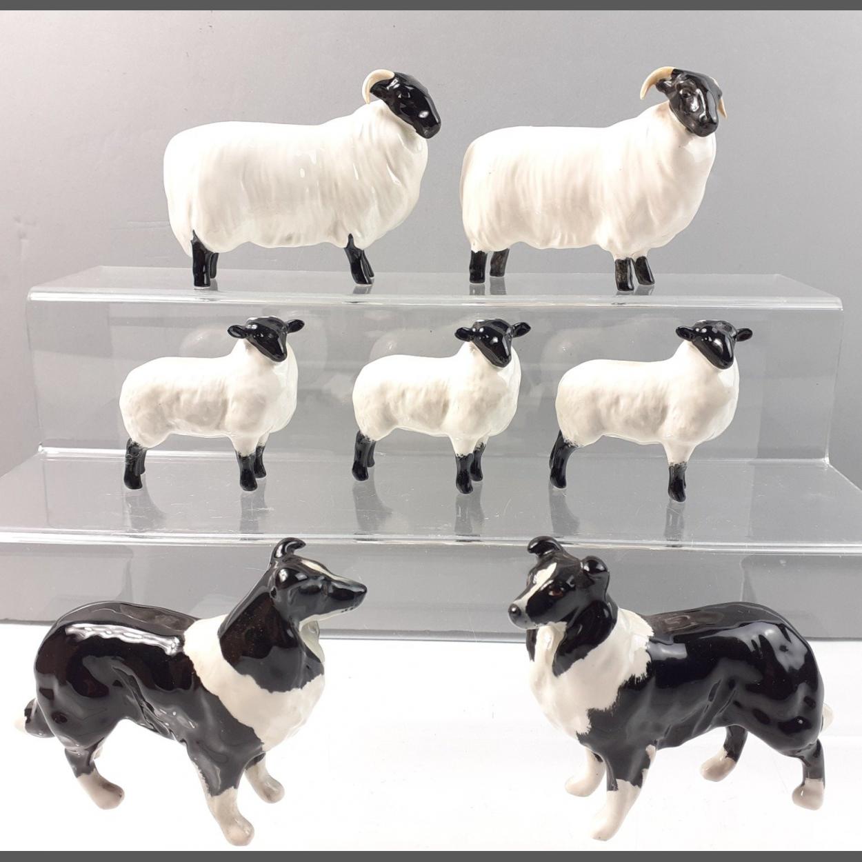 Two BESWICK sheep, 2 unmarked collies and 3 BESWICK lambs. No visible damage