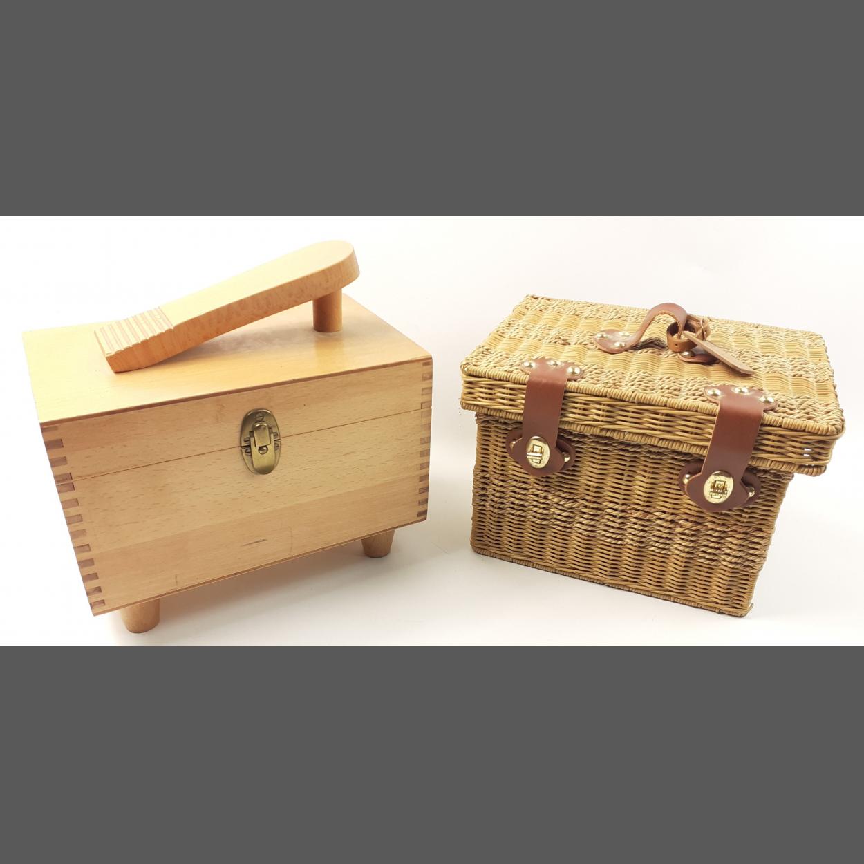 A HARROD'S lidded wicker basket to include some haberdashery items dimensions 28cm x 22cm x 19cm height approx with also a shoe-shine lidded box (as new condition) dimensions 27cm x 17cm x 20cm height approx