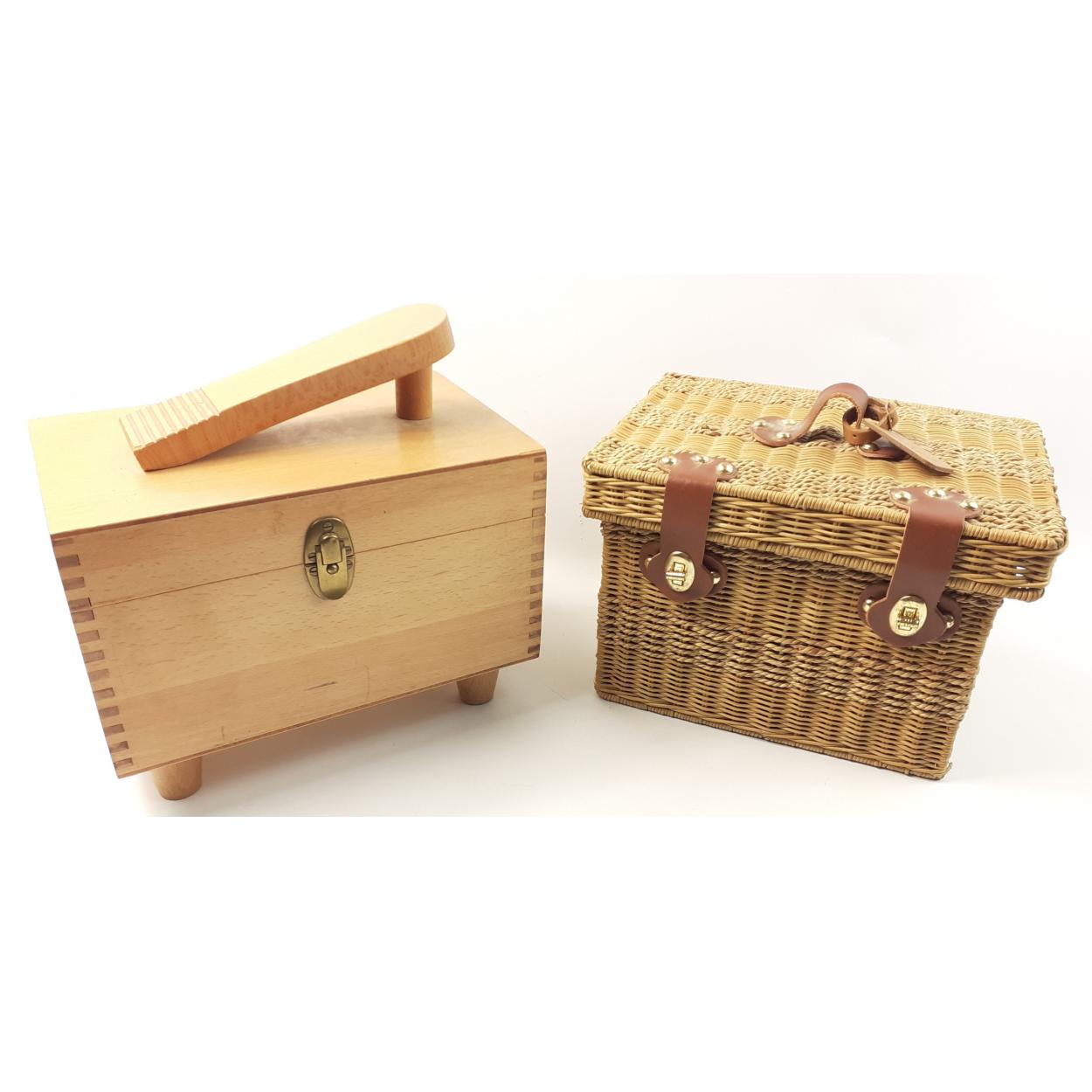 A HARROD'S lidded wicker basket to include some haberdashery items dimensions 28cm x 22cm x 19cm height approx with also a shoe-shine lidded box (as new condition) dimensions 27cm x 17cm x 20cm height approx