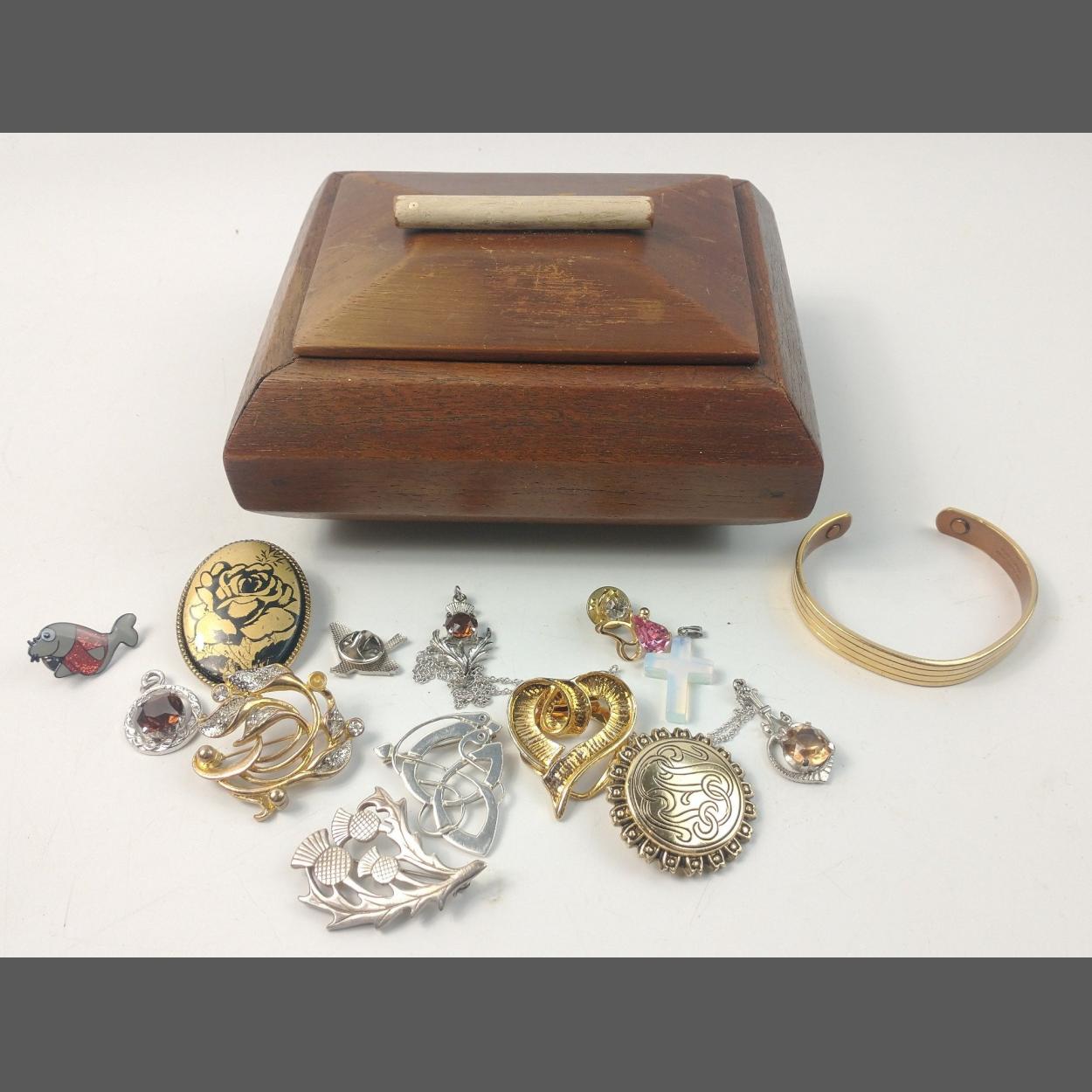 A nice STYLISH wooden 'cask style' jewellery box filled with costume jewellery and a nice SILVER 925 stamped CELTIC brooch etc