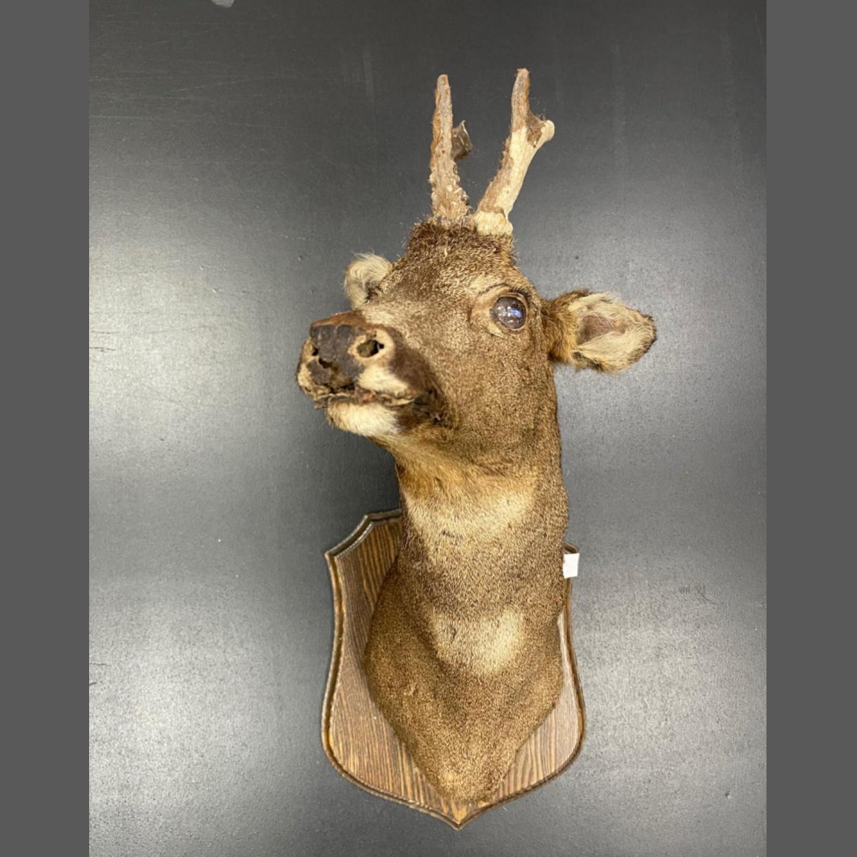 A small DOE 4 point deer mounted taxidermy head - NICE QUALITY! - 56cm height from bottom of mount to tip of antlers x 30cm width approx - a little damage to the antlers with a little of the surface missing on the tip of them - otherwise in great condition!