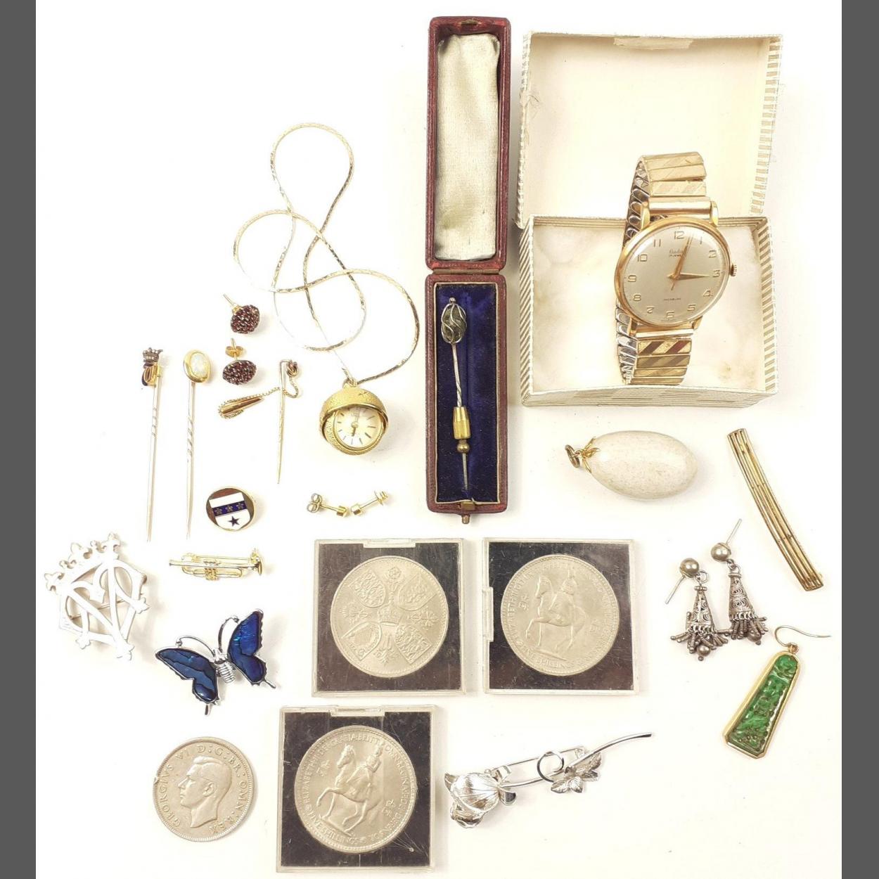 A collection of bijouterie to include gent's plated watch, a pretty ladies ball watch on chain, plated jewellery, coins and others.