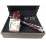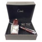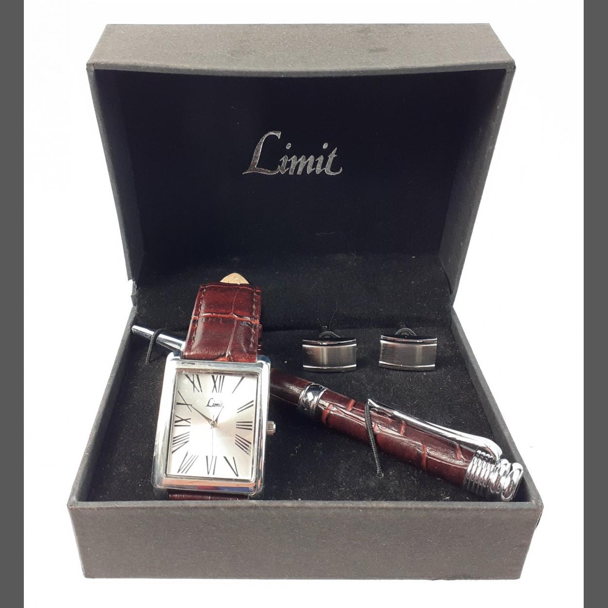 A LIMIT gift set of gent's watch, cufflinks and pen. Watch has a beautiful square face with Roman numerals and leather strap which matches the pen. Box has some damage.