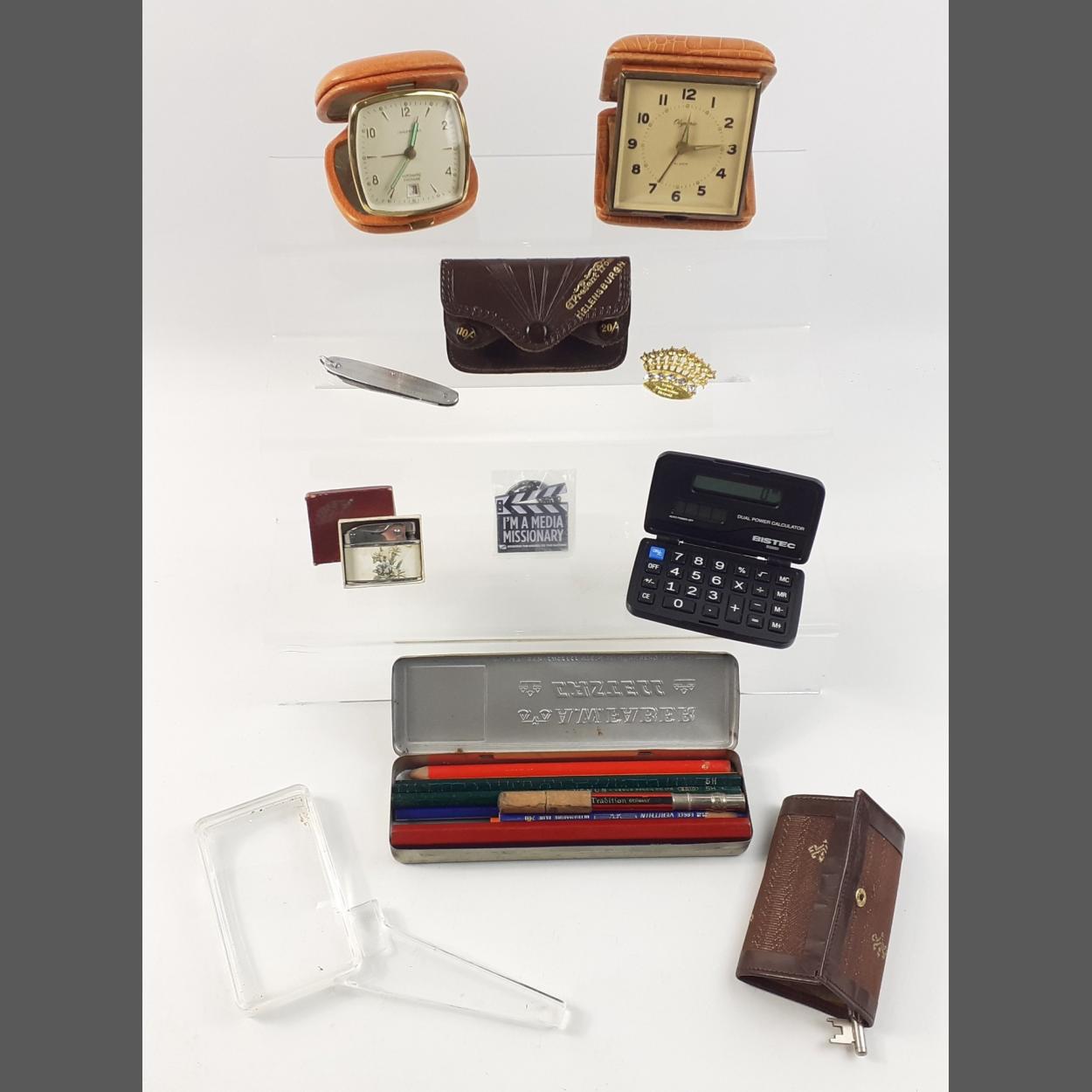 A small mixed lot to include 2 attractive travel alarm clocks by Ingersoll and Olympic and other trinkets