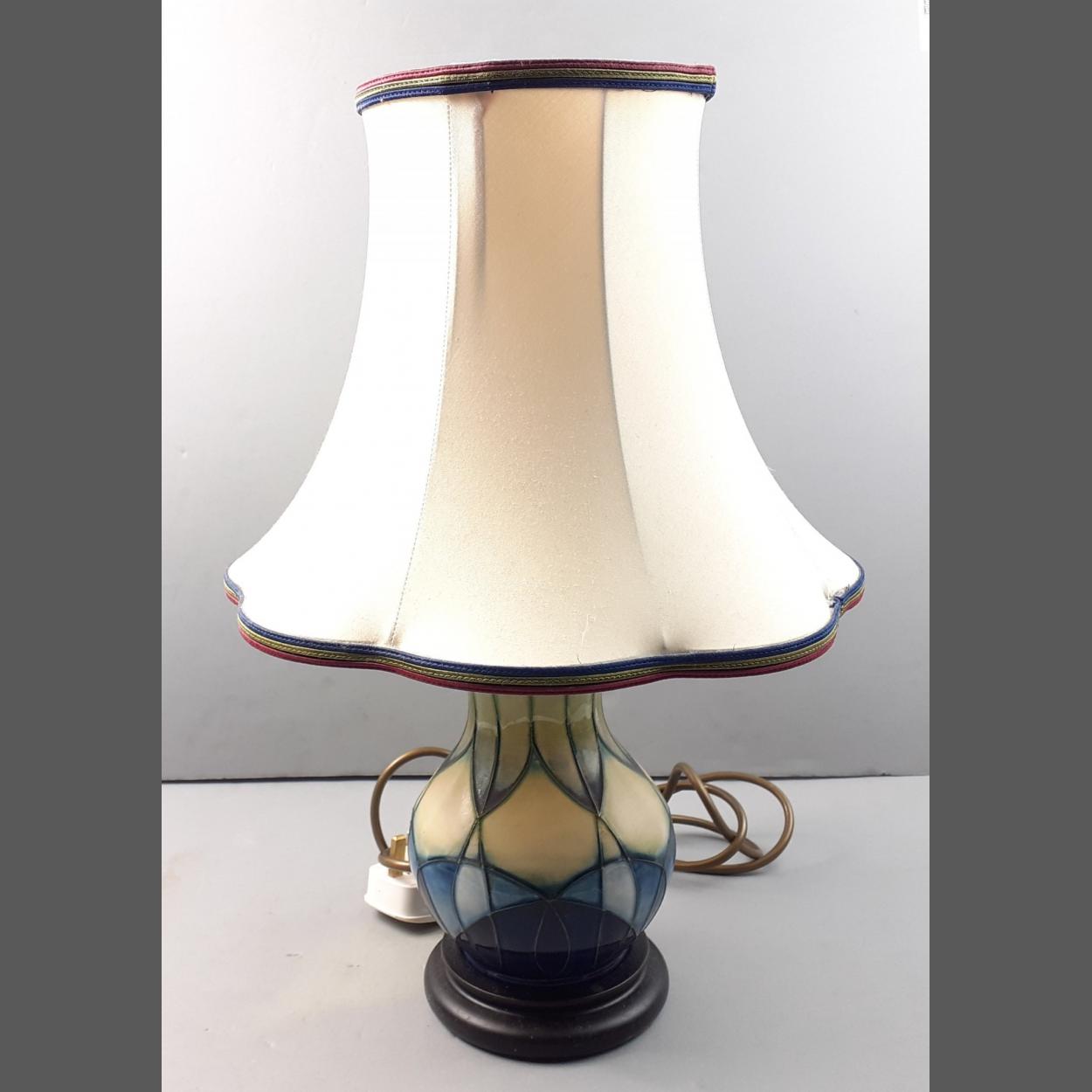 A floral MOORCROFT baluster lamp standing 43cm high approx with a 20cm base, comes with a Moorcroft cream silk shade as originally supplied. In good condition