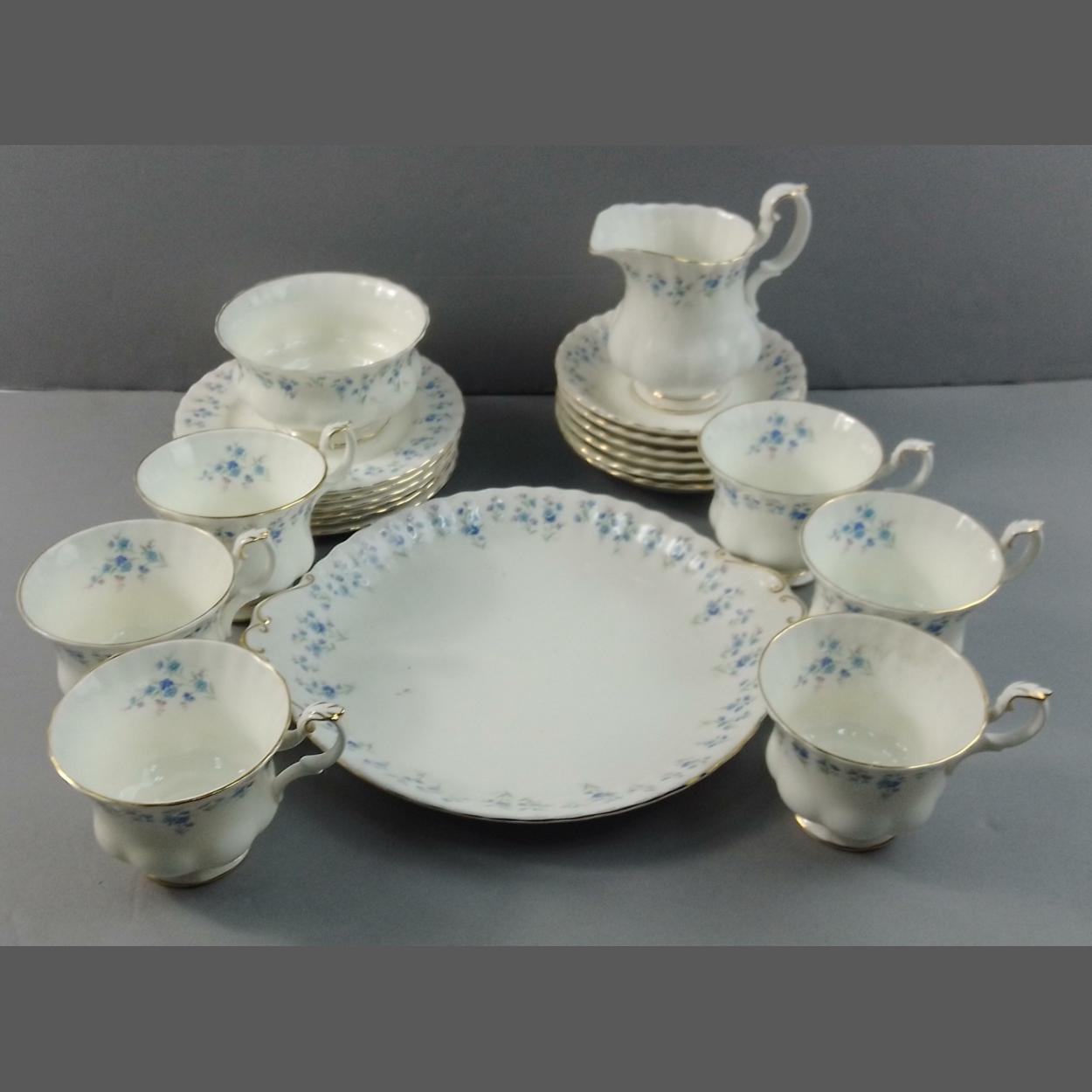 A ROYAL ALBERT Memory Lane tea service to include 6 each of cups, saucers, side plates, 1 milk jug, 1 sugar bowl and 1 sandwich plate. All in good order