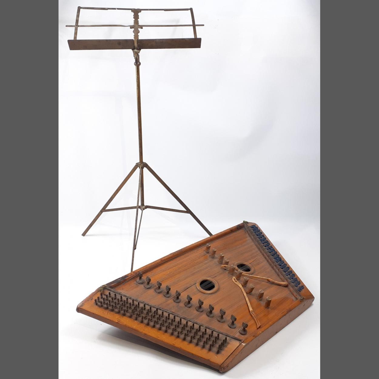 A vintage zither with some damage and signs of wear from storage, presented with a brass music stand.