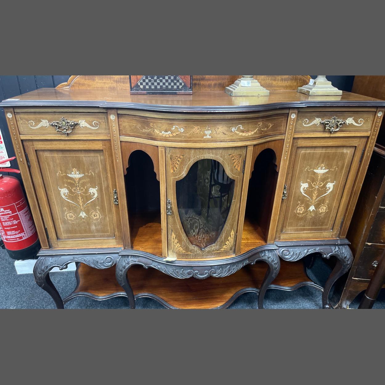 A stunning vintage centre bow-fronted sideboard, with bow legs and intricate dolphinesque inlay measures 110cmH x 137W x 50D
