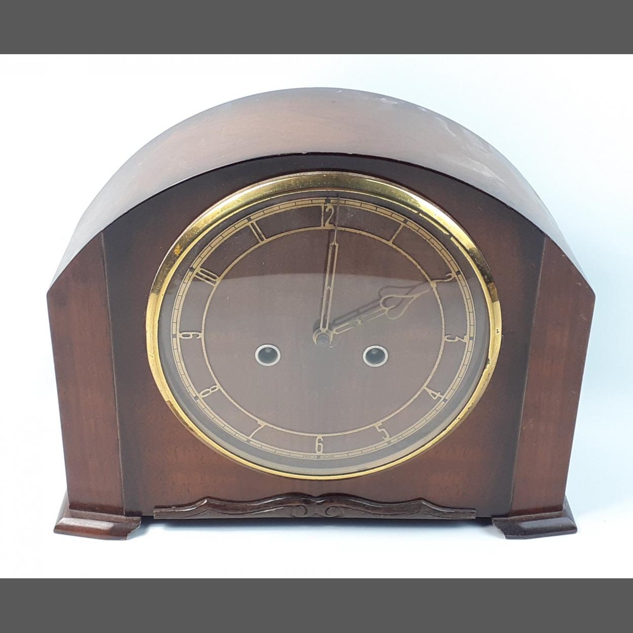 A Smiths Enfield wooden mantle clock with key. 29cm wide - 23cm tall approximately. A nice example.