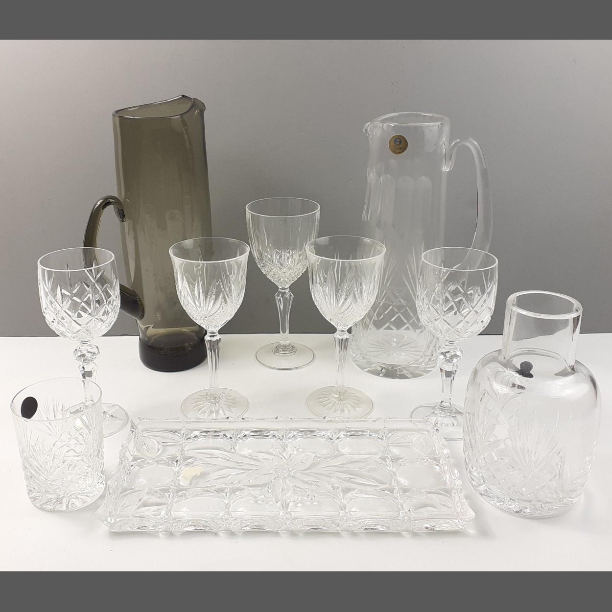 A mixed box of glassware to include two water jugs, crystal glasses and others.