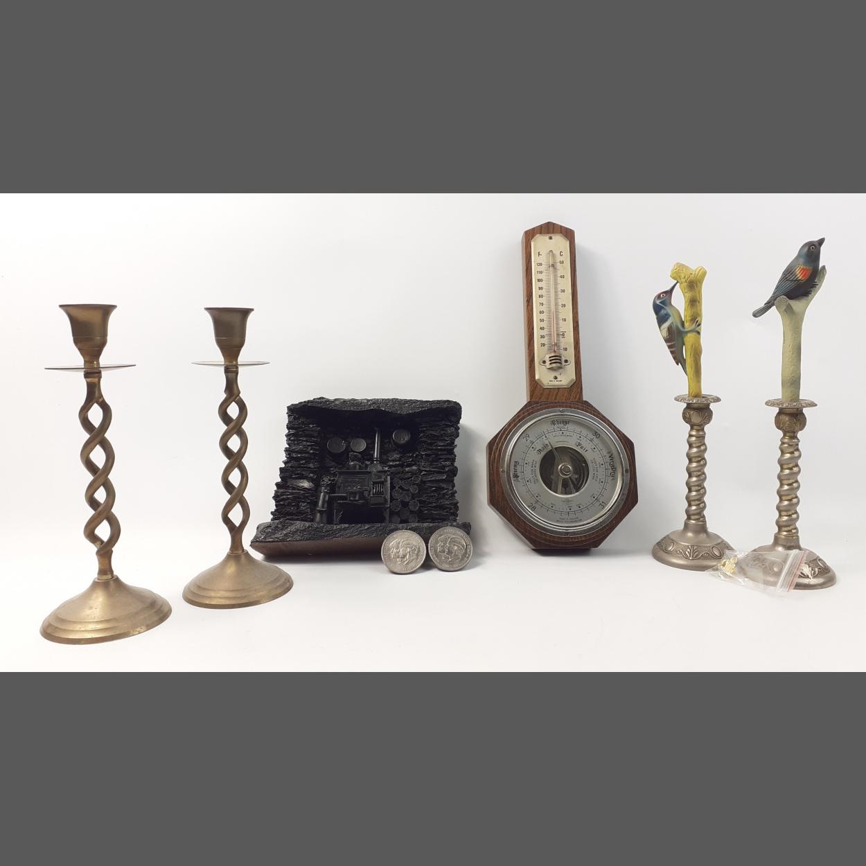 Mixed lot to include brass candlesticks, pewter candlesticks, carved coal sculpture of a fireplace and a small 32cm banjo barometer.