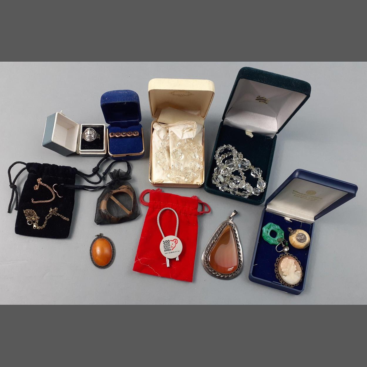 A assorted good quality costume jewellery lot. Comprising 7cm polished stone pendant, Steiff 100 years key ring, tortoise shell buckle, a pretty shell cameo, a smaller pendant, a Viking style ring stamped SILVER, 2 x crystal necklaces, a small brooch with broken pin