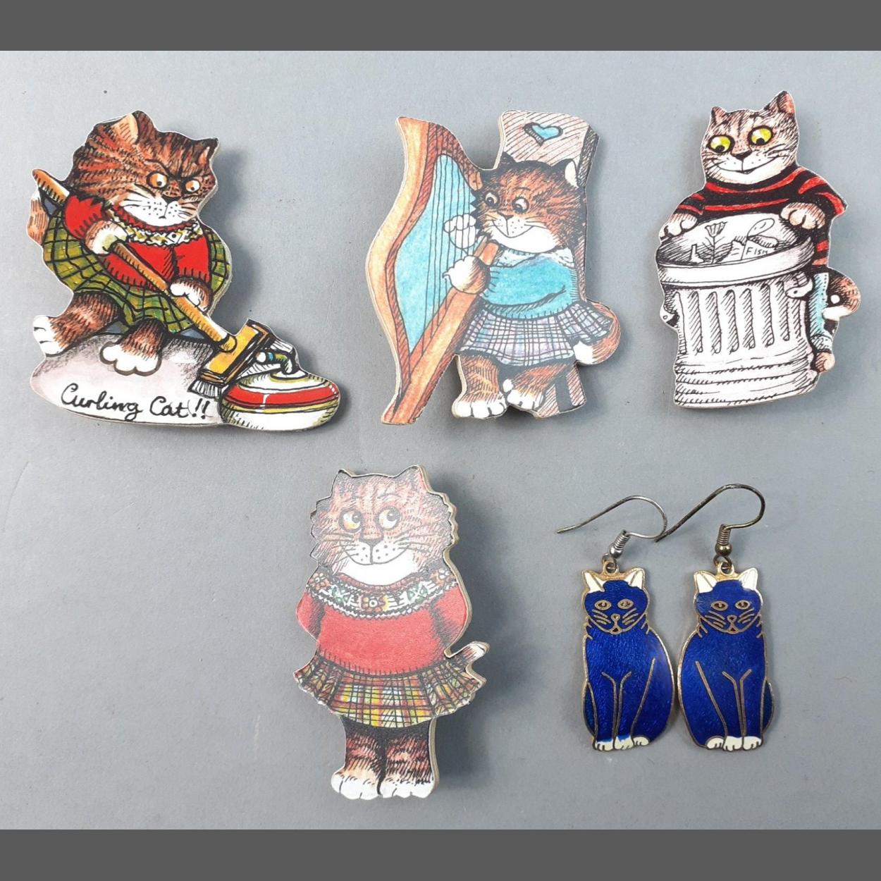 MEEOW! a cutie lot of four Maisie the Cat, designer brooches by the late Aileen Paterson of Edinburgh with 2 gilt enamel earrings.