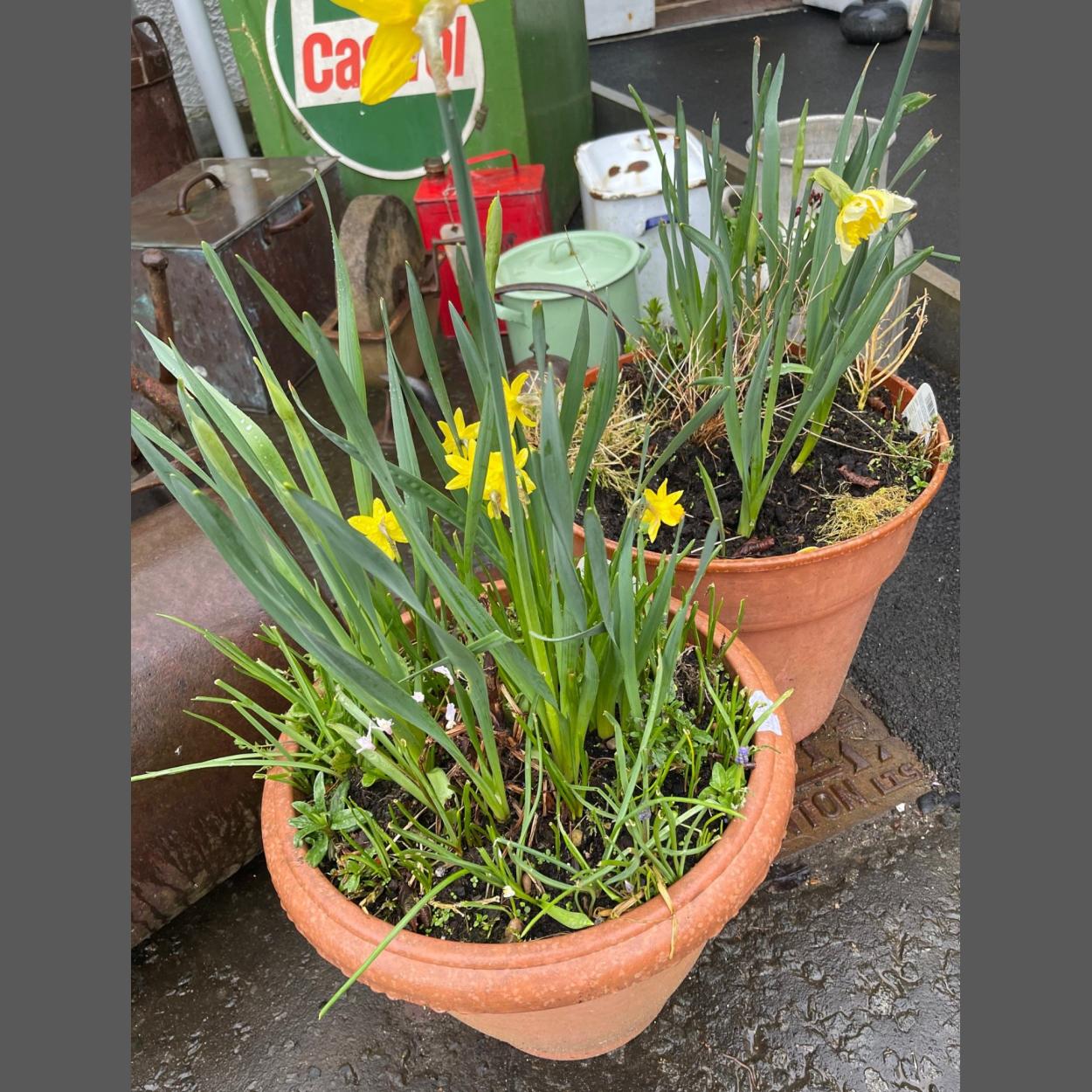 Two medium sized resin terracotta style garden planters with spring daffodil planting!