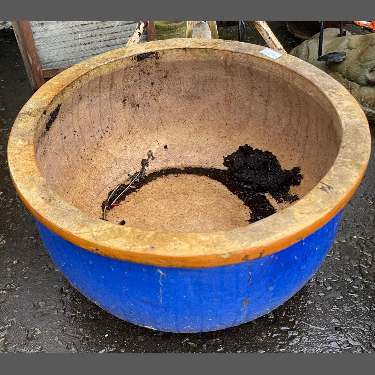 A VERY LARGE blue glazed ceramic garden planter - dimensions 11" height x 21" diameter approx - cost new £90 plus!