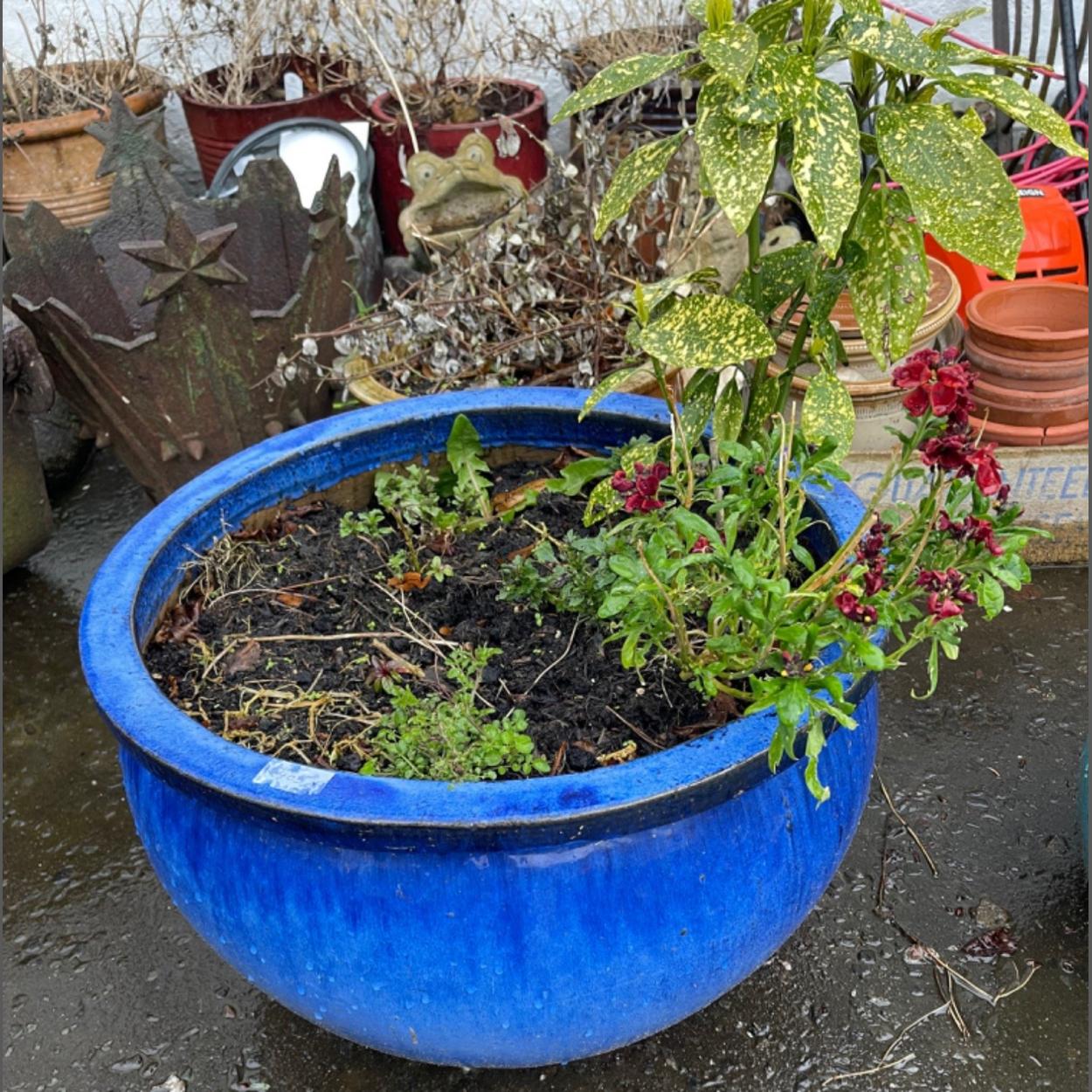 A VERY LARGE blue drip-glaze ceramic planter(frost free) 13" height x 21" diameter approx - comes with planting to get you started!