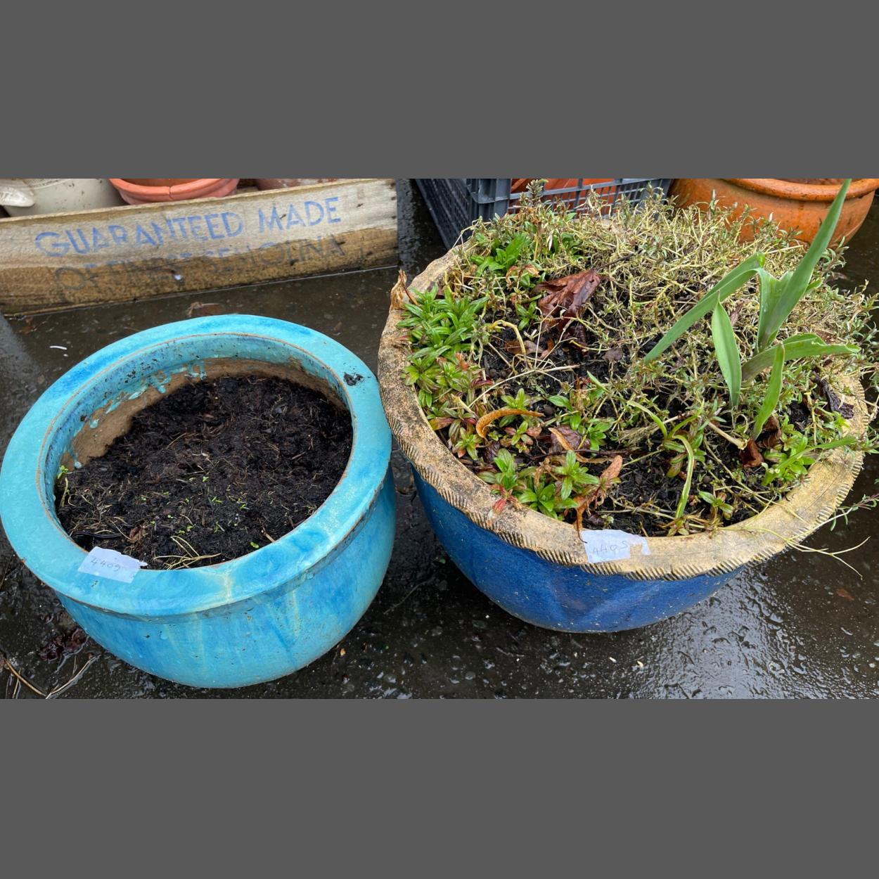 Two ceramic glazed planters -the larger complete with planting - one large and one medium sized