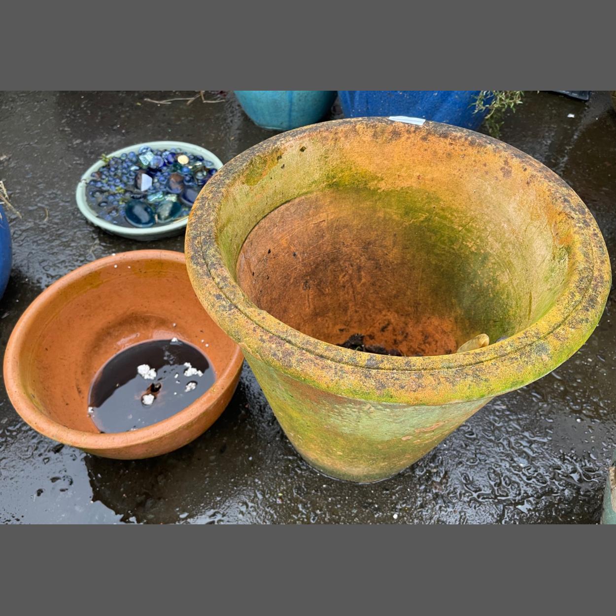 TWO TERRIFIC TERRACOTTA garden pots - one large (30cm tall) and the other smaller 12cm tall approx - to include a fantastic patina on the larger pot!