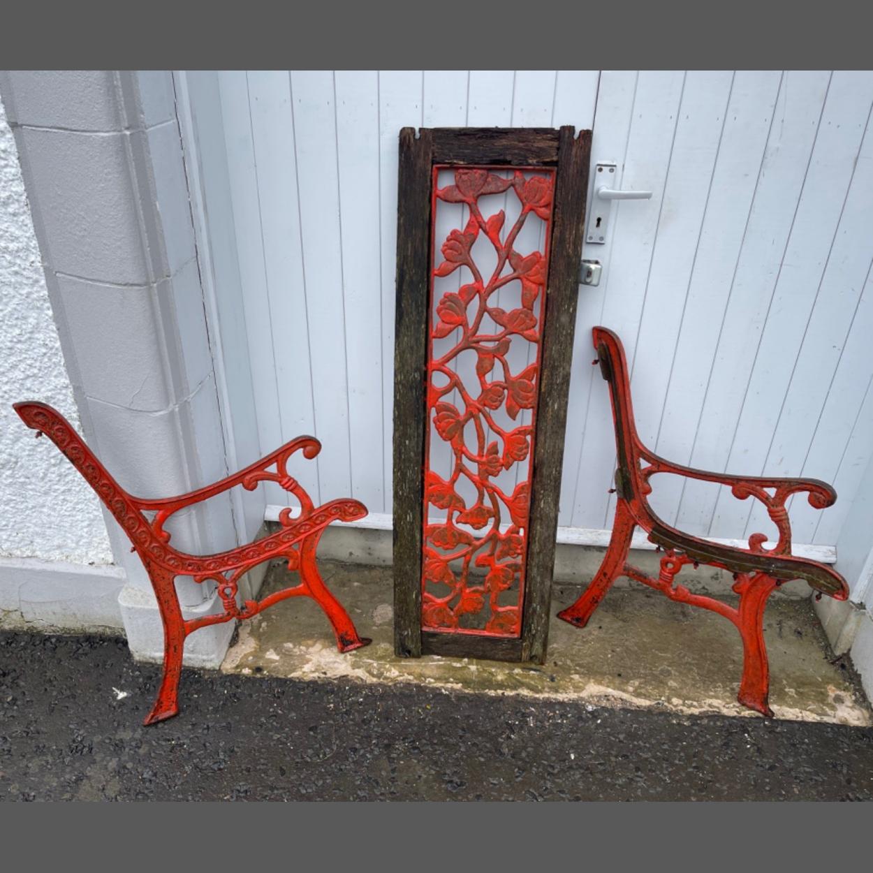 A pair of heavy cast iron garden bench ends with the seat back also - ideal for the garden DIY project!