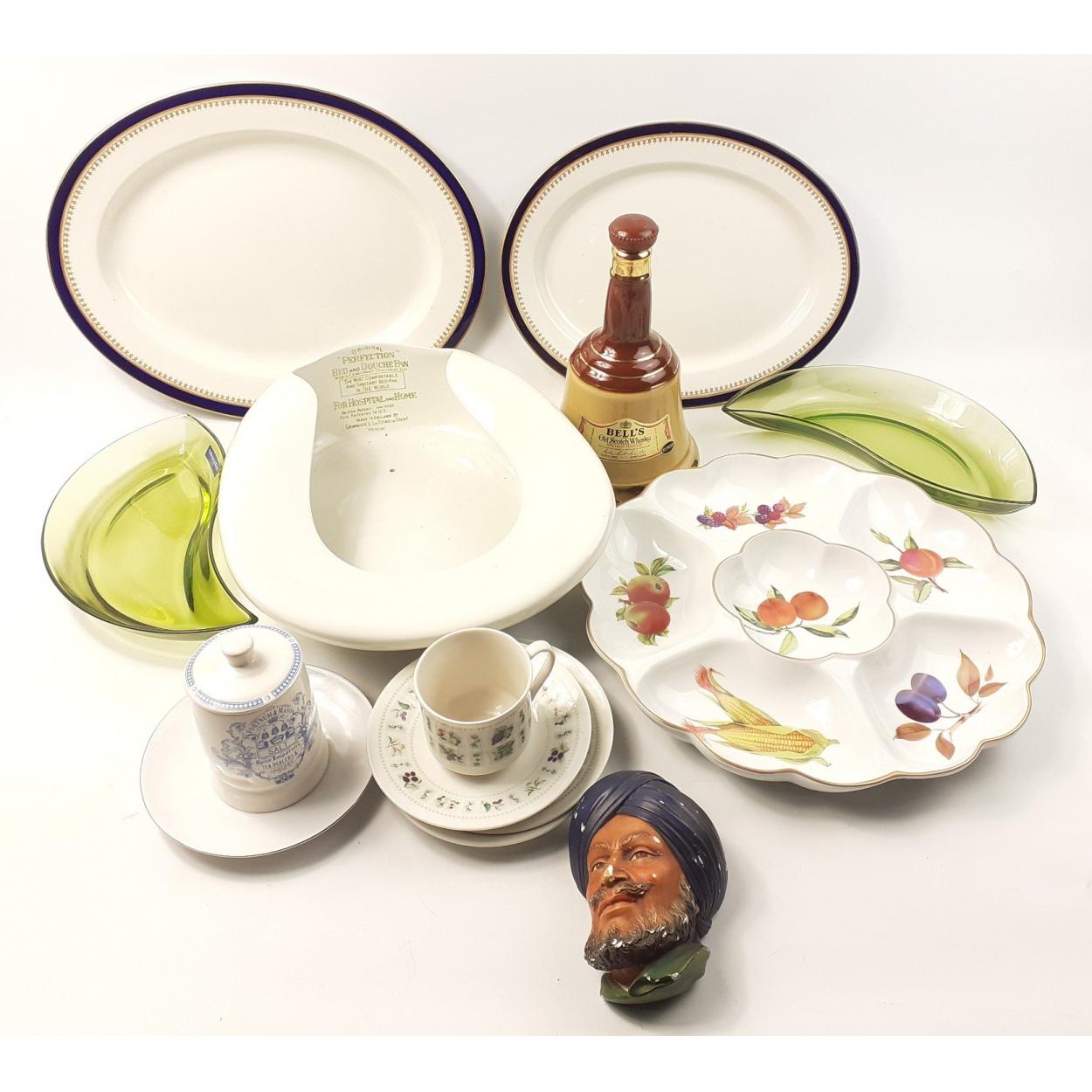 A mixed ceramic lot to include empty Bell's decanter, a ceramic Sikh bust, tableware and a boxed ROYAL WORCESTER Evesham hors d'oeuvres tray