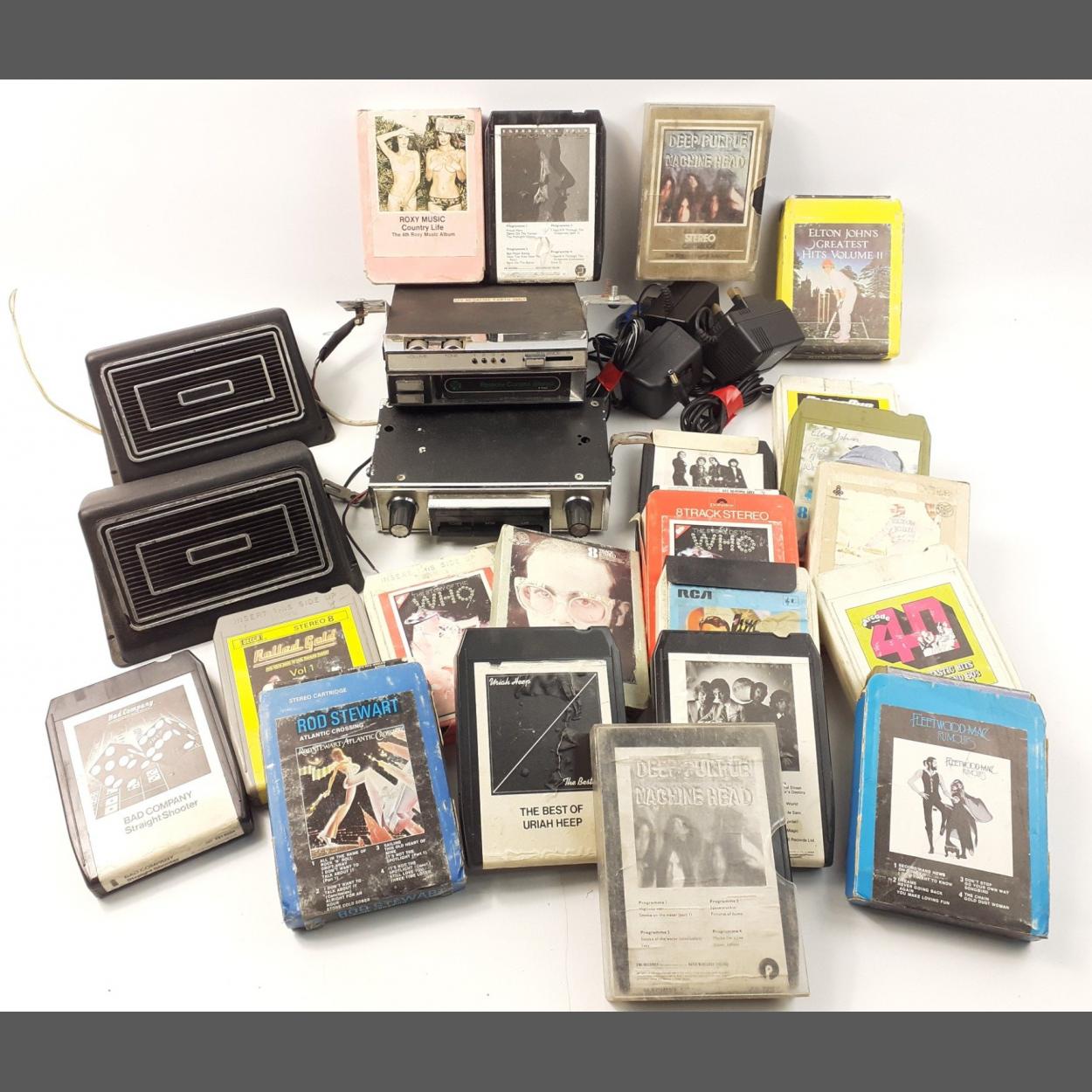 A PYE 8 track stereo system with speakers and a super quantity of 8 track tapes including Elton John, Status Quo, Deep Purple, The Who etc