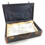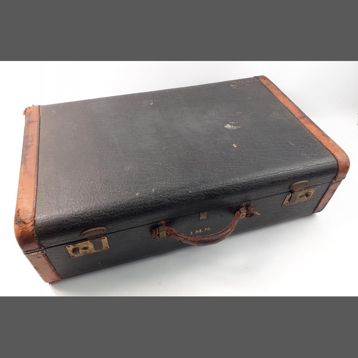 A vintage leather bound suitcase with attractive silken lining with working catches, intact handle and nice gold embossed initials. Made by Belber