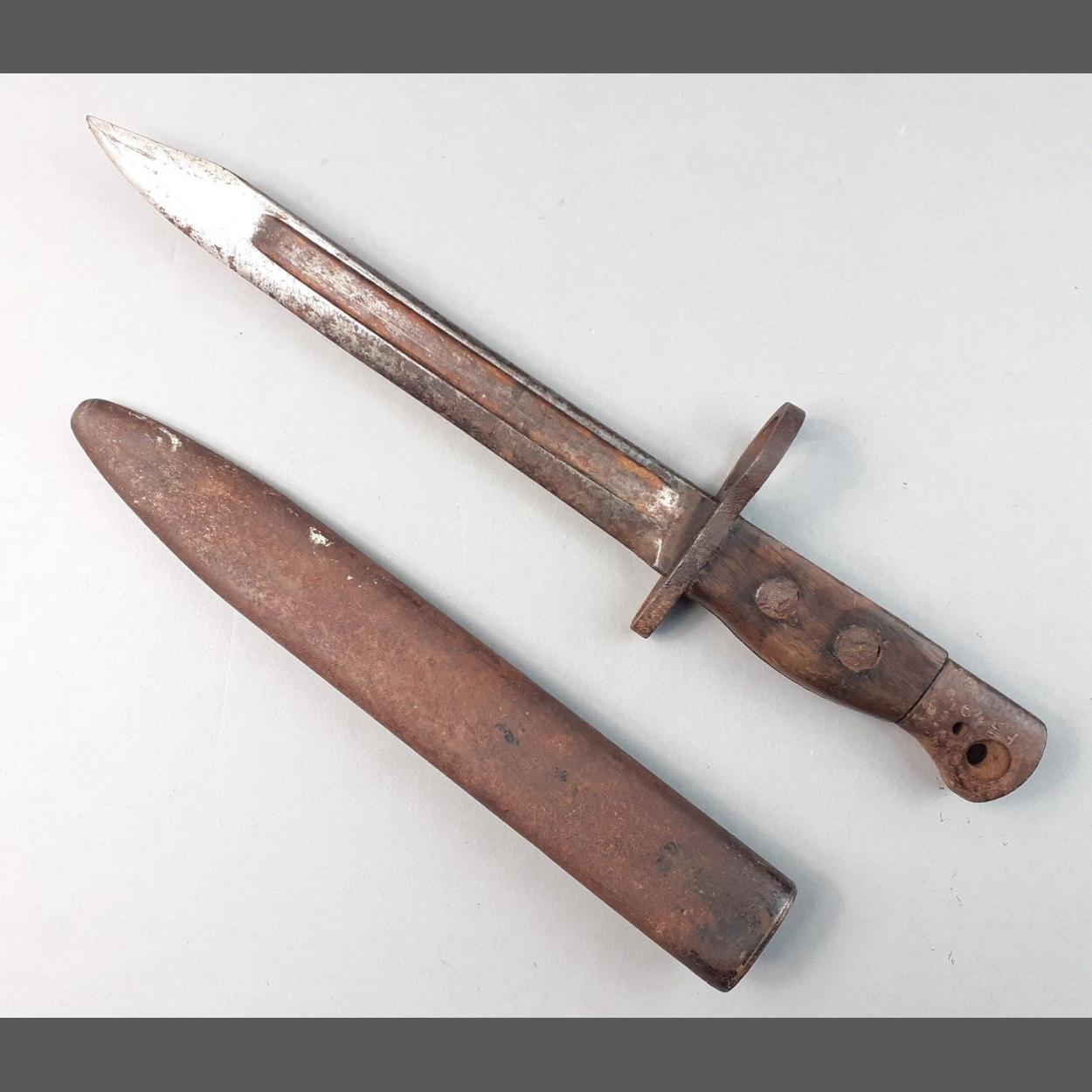 An original vintage bayonet with metal scabbard 19cm fullard blade as found condition