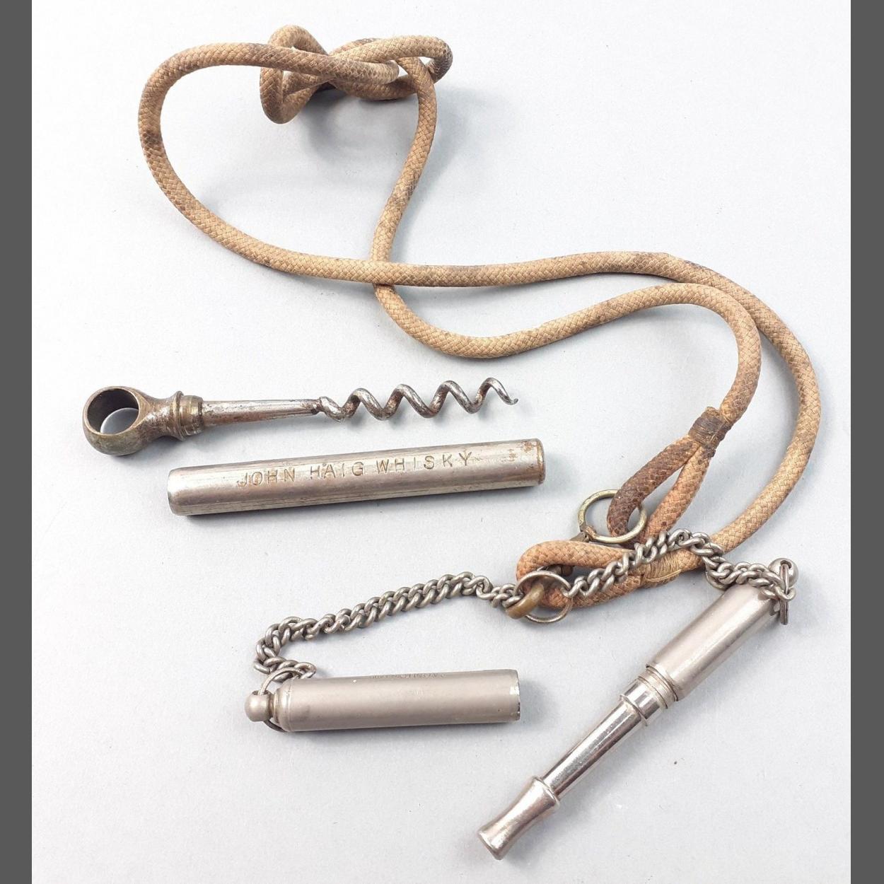 A super little lot of advertising including an ACME dog whistle on neck rope and a JOHN HAIG whisky corkscrew