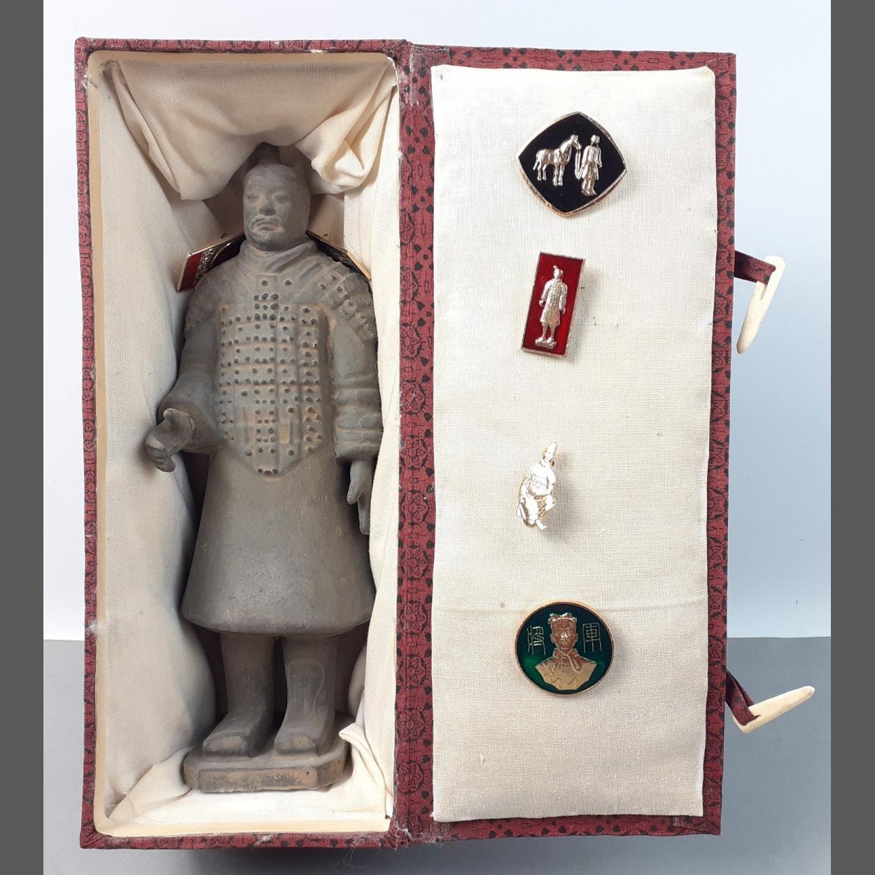 A boxed souvenir Terracotta warrior standing 22cm tall with tin badges