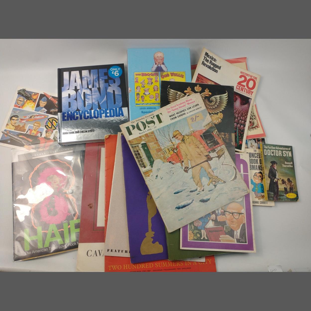 A lot of ephemera to include American Military Uniforms 1976 calendar, Edinburgh bicentenary of the New Town exhibition programme,1986 Thunderbirds exhibition programme, original programme for Hair and a Bruce Springsteen programme -Tunnel of Love, Oor Wullie and a James Bond encyclopedia